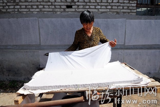 襄汾縣鄧莊鎮西侯村帝堯麻箋廠的一位女工在曬紙。