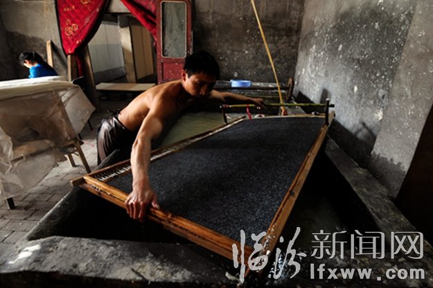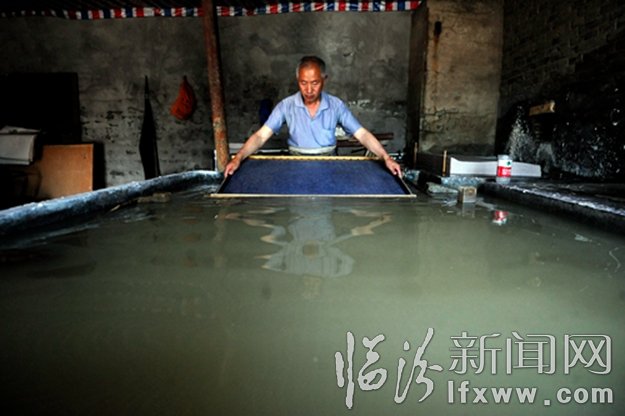 襄汾縣帝堯麻箋廠的工人正在撈紙。