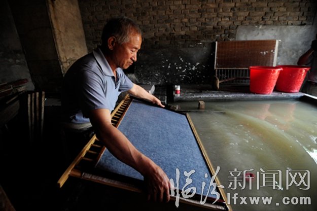 在襄汾縣鄧莊鎮西侯村帝堯麻箋廠,有30年造紙經驗的鄧僧安老人在撈紙。