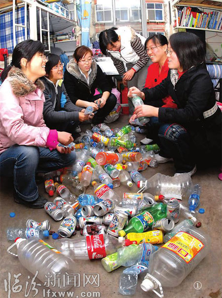 在山西師范大學(xué)校園里,物理與信息工程學(xué)院0602班的8名女學(xué)生,兩年來利用課余時(shí)間撿回8000多個(gè)飲料瓶,用賣廢品的錢建立“愛心賬戶”,并以愛心基金的名義為公益事業(yè)和四川地震災(zāi)區(qū)捐款1100余元。閆銳鵬攝