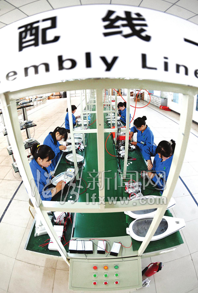 6月18日,山西光宇電源有限公司裝配車間的工人正在生產線上作業。該公司是集大功率LED光源、LED室內外照明等產品的研發、制造、銷售、安裝于一體的高新技術產業,產品遠銷美國、英國等40多個國家。 本報記者 閆銳鵬 攝