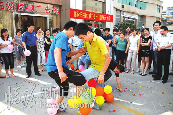 6月26日,臨汾日報社組織開展了一場慶“七一”趣味運動會,活動包括拔河、踢毽子、踩氣球、兩人三足趣味比賽等項目。 在活動過程中,全體干部職工積極參與,頑強拼搏,以昂揚向上的精神風貌喜迎中國共產黨成立88周年。本報記者 魏華 攝
