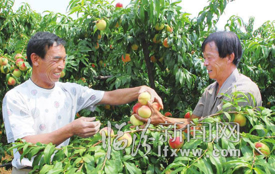 近日,堯都區(qū)賀家莊鄉(xiāng)蘇寨村村民在采摘桃子。蘇寨村利用當(dāng)?shù)睾0胃?、溫差大的氣候特點(diǎn)栽種優(yōu)良桃子,深受市場(chǎng)歡迎,農(nóng)民靠栽種桃樹(shù)畝產(chǎn)增收4000余元。 本報(bào)記者 閆銳鵬 實(shí)習(xí)生 牛藝龍 攝