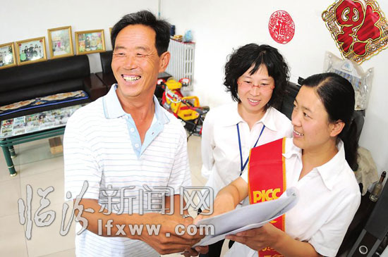 8月3日,鄉寧縣城關村54歲的村民崔春榮(左一)高興地說:“政府給咱老百姓買保險啦”。 今年,鄉寧縣政府出資70余萬元,由縣民政局作政府委托投保人,為全縣23萬名群眾統一購買了自然災害公眾責任險。 本報記者 李虎威 攝