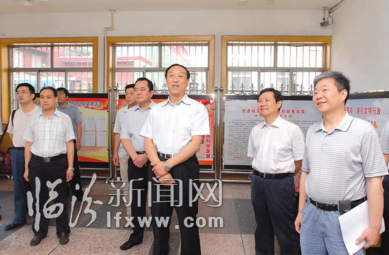 圖為謝海在市財政局調研期間觀看版面展。記者閆銳鵬攝