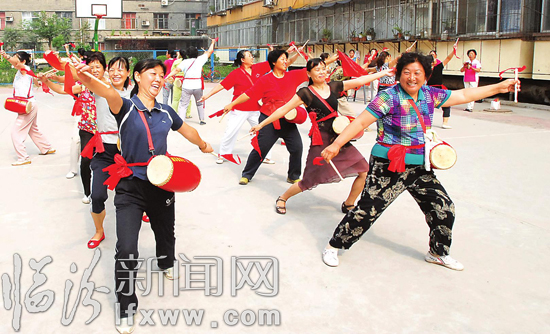 連日來(lái),我市社區(qū)街道及各級(jí)工會(huì)組織群眾加緊排練文藝節(jié)目,以不同的方式迎接新中國(guó)成立60周年。圖為我市平陽(yáng)社區(qū)地質(zhì)小區(qū)的腰鼓隊(duì)在排練節(jié)目。 本報(bào)記者 閆銳鵬 攝