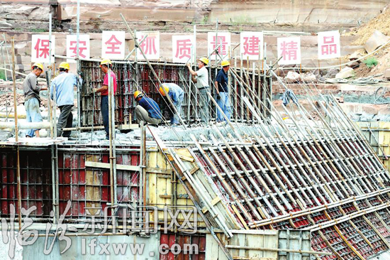清峪水庫是鄉(xiāng)寧縣響應省委、省政府“興水戰(zhàn)略”號召,為解決縣城吃水問題建設的一處應急水源工程,預計2010年6月全面竣工??⒐ず?,每年可向縣城及周邊企業(yè)提供用水154.4萬立方米,解決6萬人的吃水問題,同時,可為下游4000畝耕地提供灌溉用水。圖為8月12日,建設者在清峪水庫工地緊張施工。 本報記者 李虎威 攝