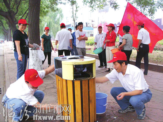 8月21日,侯馬市啟動文明和諧單位“文明使者”志愿服務活動。 該活動每月一主題,本月主題是“撿拾的是垃圾,凈化的是家園,美麗的是心靈”。圖為“文明使者”從自身做起,從身邊小事做起,走上街頭擦拭垃圾桶、電話亭,撿拾垃圾、煙頭。 王鵬鵬 杜枚珍 攝