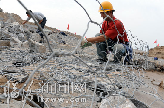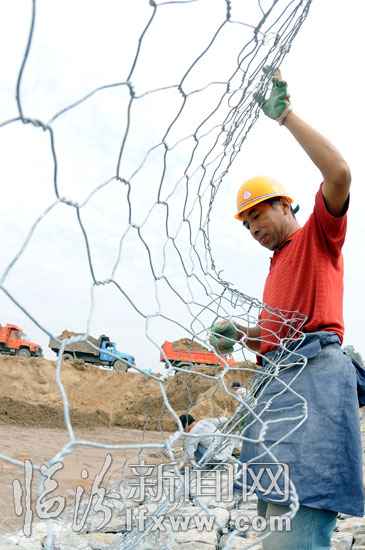 工人師傅正在制作用于加固內河堤岸的鉛絲籠場景一