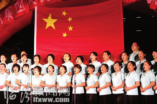 9月24日晚,保衛黃河》、《毛主席的話兒記心上》、《大中國》等近百首革命歌曲在市第四人民醫院唱響。為了慶祝新中國成立60周年,該院組織600余名醫護人員,開展了“頌祖國”合唱比賽活動。 記者 劉臨喜 攝
