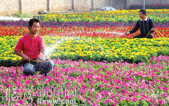 9月24日,在天盛達工科貿有限責任公司花卉基地,工人師傅正在澆花。該公司引進、培育了金菊、串紅等10余個新品種,準備在國慶節前陸續上市,為新中國60華誕獻禮。記者 閆銳鵬 攝