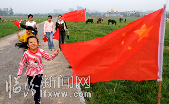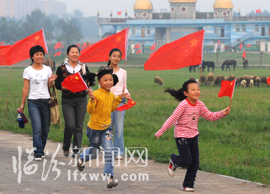9月26日,小朋友手舉國旗在高興地玩耍。十一臨近,山西省臨汾市怡呼貝爾草原牧場掛起2009面國旗,迎接新中國60周年華誕。
