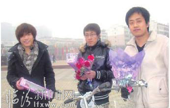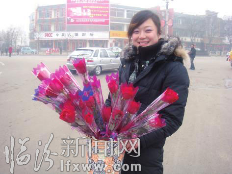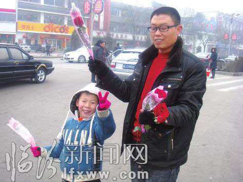今年春節(jié)正好是2月14日,與西方情人節(jié)是一天。記者在我市的鼓樓廣場、平陽廣場等多處都看到,有許多手捧玫瑰花的大學(xué)生和小學(xué)生,采訪中他們說:現(xiàn)在人們生活條件都好了,比較重視精神享受,正好春節(jié)這天跟情人節(jié)在一起,是真正的中西結(jié)合的好日子。我們年輕人不能老是躺在父母的懷抱里,要融入社會(huì),從今天起,我們要學(xué)會(huì)自立?!蔽滟Y博小朋友和他的爸爸一起在鼓樓廣場賣玫瑰花,他爸爸說:今天讓孩子出來賣花,是為了讓他體驗(yàn)財(cái)富的創(chuàng)造過程,體會(huì)勞動(dòng)的快樂,對(duì)他以后的成長會(huì)有好處。”武資博小朋友高興地對(duì)記者說:阿姨,今年的春節(jié)太有意思了,我都會(huì)掙錢了,已經(jīng)賣了6支玫瑰花了?!闭f話時(shí)他還興奮地做了一個(gè)勝利的手勢! (記者 衛(wèi)紅麗 攝影報(bào)道)