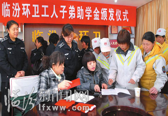 3月26日,在我市環衛工人子弟助學金發放儀式上,環衛工人高興地領到助學金。當日,臨汾市房地產協會為今年考上大中專院校的45名環衛工人子弟發放4.3萬元助學金,幫助困難環衛家庭渡過難關。 本報記者 閆銳鵬 攝