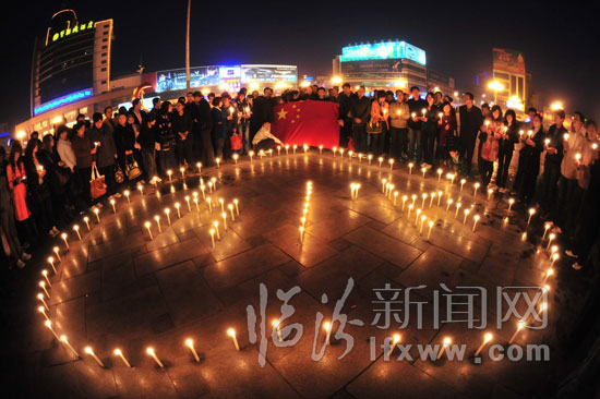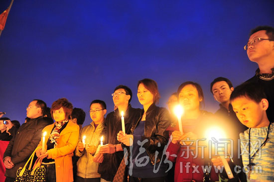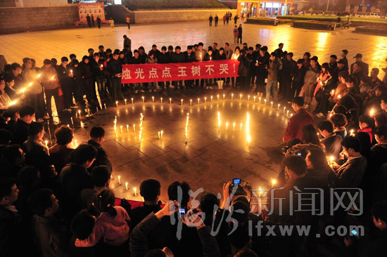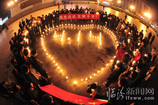 臨汾新聞網訊 4月21日傍晚,堯都區300名大學生“村官”相約來到臨汾平陽廣場,舉行“燭光點點 玉樹不哭!”燭光哀悼活動,許多市民們也積極加入到活動中。人們在“村官”的代表統一安排下,手捧燭光靜靜默哀三分鐘,向玉樹遇難的同胞哀悼。(臨汾新聞網記者 李虎威 攝)