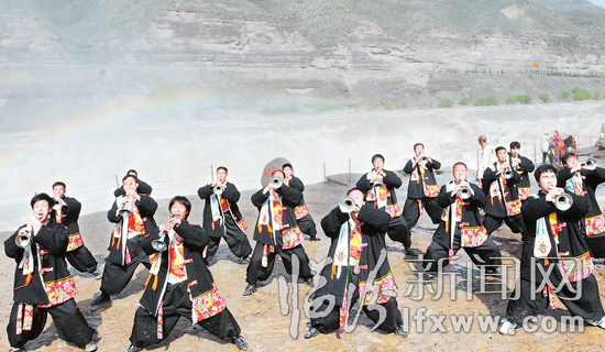 4月22日,為備戰世博會,嗩吶手在吉縣壺口瀑布岸邊進行排演。據了解,世博會期間,吉縣壺口嗩吶隊將參加上海世博會山西活動周多場大規模演出,他們將把濃郁的黃河文化展示給全世界。本報記者 李虎威 攝