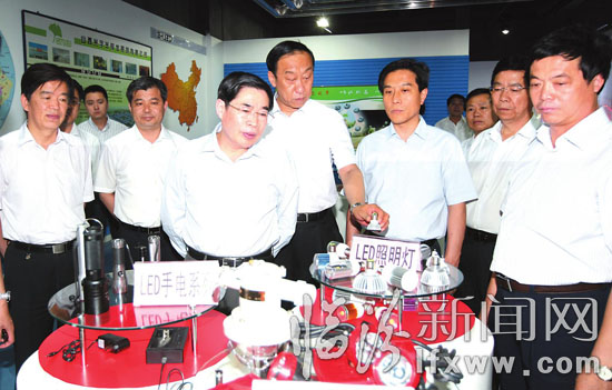 6月22日至23日,省委書記袁純清深入我市檢查指導工作。他強調,面對轉型發展、跨越發展的繁重任務,要提振精神,鼓足干勁,以昂揚向上的面貌,干事創業的姿態,勤政廉政的作風,加快推進臨汾新型工業大市建設。省委常委、省委秘書長高建民一同檢查。省委副秘書長張瑞鵬,省委宣傳部常務副部長楊波,省發展和改革委員會主任李寶卿,省經濟和信息化委員會主任洪發科,省農業廳廳長孫連珠隨同檢查。市領導謝海、羅清宇、王文英,市長助理、市公安局局長安占功陪同。市委常委、副市長趙建民,臨汾經濟技術開發區黨工委書記林澤忠,管委會主任尚日紅,侯馬經濟技術開發區管委會主任李山林,黨工委書記張如意分別陪同。圖為省委書記袁純清在光宇電源有限公司檢查指導工作。 本報記者 李虎威 攝