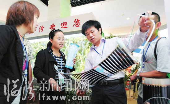 9月16日,參觀者在我市展區觀看低碳產品——雙銀電熱膜。在第三屆中國(太原)國際能源產業博覽會上,我市的節能環保產品成了此次博覽會的亮點。 (記者 李虎威 攝)