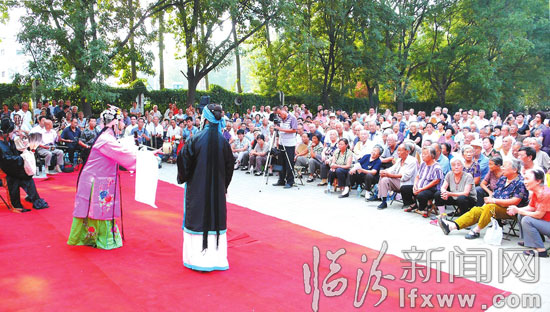 9月19日下午,侯馬市街頭游園內,路東辦事處新田路社區的居民們在觀看戲曲表演。為豐富社區居民的文化生活,迎接中秋、國慶“兩節”的到來,該社區開展戲曲專場演出,邀請該市夕陽紅文藝演唱團為轄區居民帶來精彩的蒲劇、眉戶劇表演。