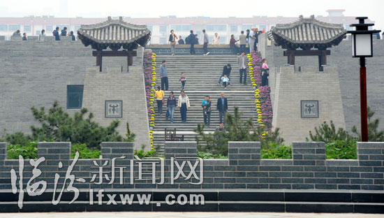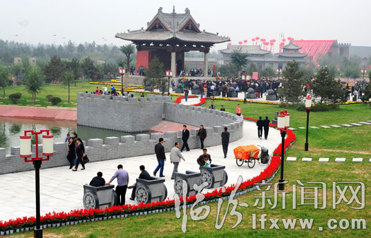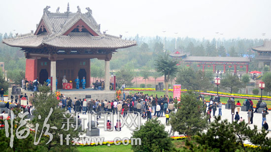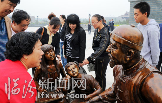 9月30日,在臨汾古城公園,市民在園區(qū)觀看文化雕塑。