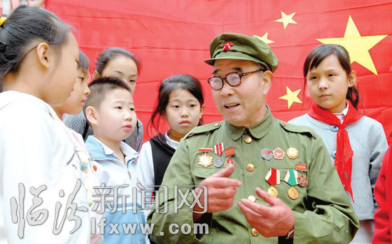 圖為在臨汾功臣小區,小朋友們在聽臨汾軍分區干休所82歲李順興老爺爺講革命故事。 李虎威 單維啟 攝