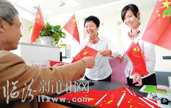 圖為中國銀行臨汾市分行員工通過在各營業網點懸掛國旗和燈籠以及向辦理業務的客戶贈送國旗等禮物,祝福偉大祖國繁榮昌盛。 閆銳鵬 攝