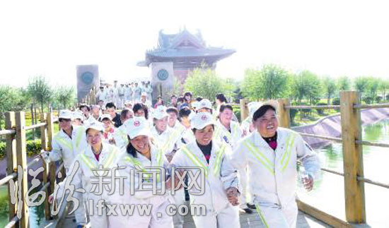 圖為市環衛工人們利用假期在暢游剛修建好的古城公園。 李虎威 攝