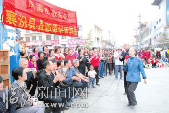 圖為襄汾縣老年舞蹈愛好協會的老人們,在縣中心廣場以豐富多彩的文藝節目慶祝國慶。 賈玎玎 攝