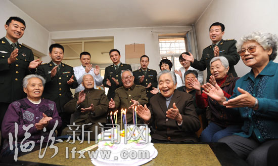臨汾新聞網訊 重陽節前夕,駐臨某部隊官兵來到臨汾軍分區干休所,看望耄耋老人,為他們送去了節日的祝福,官兵與老人們拉家常,唱紅歌,載歌載舞,歡歌笑語,祝革命老前輩健康長壽,安度幸福晚年。(李虎威 郭昭彬 攝)
