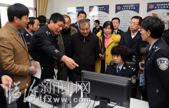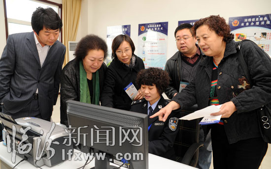 11月13日,在市公安局交警支隊車管所,來自社會各界的政風行風監督員在了解車輛管理新業務。當日,市公安局召開2010年政風行風評議聽證對話會。15名各界代表對市公安局今年以來在公安工作和近期老百姓關心的熱點、難點問題提出了一些中肯的意見和建議。對于提出的問題,市公安局各各部門負責人本著認真、務實的態度,都做出了客觀、負責的回答,確保政風行風建設真正取得實效、惠及群眾。(記者 閆銳鵬 攝影報道)