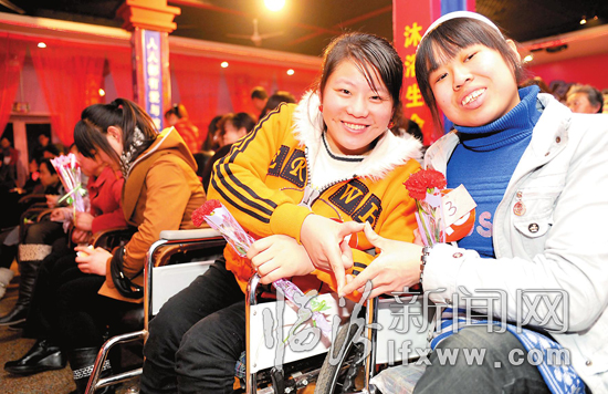 國際殘疾人日期間,我市舉行了主題為“有愛的冬天,殘疾人不冷”殘疾人交友派對聯歡活動,我市160余名殘疾人參加了才藝秀、真情告白等聯歡派對活動。圖為兩名殘疾人在派對聯歡活動中結為好友。