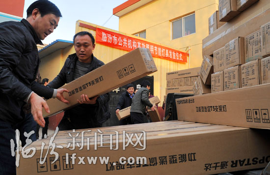臨汾新聞網訊 12月23日,市直機關的工作人員在搬運高效照明節能燈具。為進一步推進公共機構節能減排工作,市政府機關事務管理局、發改委、財政局籌集資金93.18萬元,為市直各公共機構全部更換國家推廣的高效節能照明燈具60285套,全力推進節能減排工作。(記者 閆銳鵬 通訊員 王西周 攝)