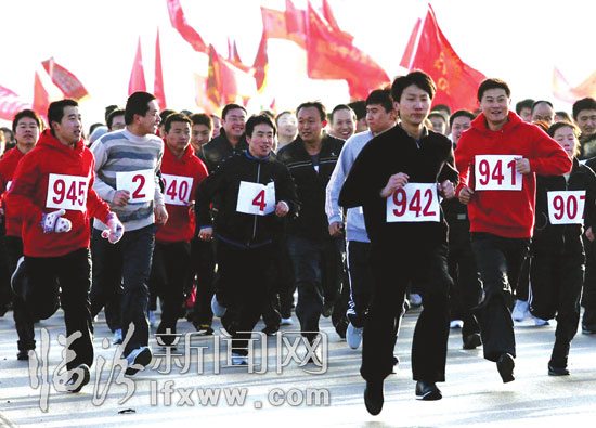 12月30日,我市90多個單位近萬名群眾齊聚鑼鼓大橋,參加由市總工會、市體育局共同舉辦的全市“建功‘十二五’、建設新臨汾、職工迎新年”冬季萬人長跑活動。 此次長跑活動從鑼鼓大橋出發,經濱河西路轉至彩虹橋,最后到達終點——古城遺址公園西門,全程5000米。據了解,此次賽事規模之大、規格之高,在我市群眾體育活動中還是第一次。 記者 趙文家 攝