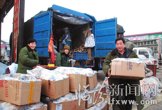 為保障節日期間市場供應,我市有關部門積極協調配合,組織貨源、暢通運輸、合理調配,滿足了廣大市民購物需求。圖為1月4日,在臨汾堯豐蔬菜批發市場,菜農們正在搬運蔬菜。記者 李自強 攝