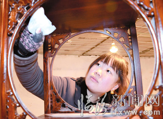 2010年,唐人居古典家具公司傳承的“晉作家具技藝”被列為國家級非物質文化保護項目。在挖掘和創新傳統家具制作技藝的同時,該公司還為500余位農村剩余勞動力提供了就業崗位。圖為一名員工在擦拭完工后的家具。 劉利平 攝