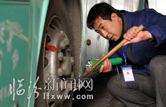 1月19日,臨汾道路運輸管理處的工作人員在檢查營運車輛安全設施。