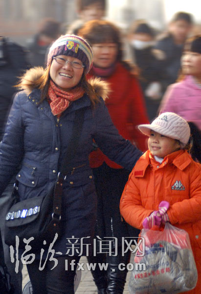 1月19日,在臨汾火車站,一對母女高高興興乘車回家。