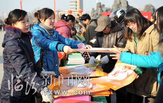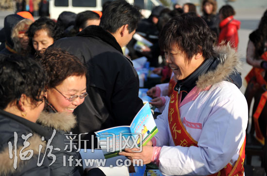 新聞出版系統服務隊的工作人員在為群眾發放年畫。