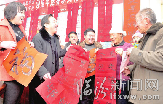 近日,堯都區文聯工作人員在堯都區土門鎮李仵村村民文化活動中心向村民展示春聯作品。當日,我市“新農村春聯大比拼”活動在李仵村舉行,市楹聯學會和堯都區文聯、書協的工作人員與村民互動,以新農村建設為主題,現場擬春聯、對春聯、寫春聯,迎接春節的到來。記者 閆銳鵬 攝
