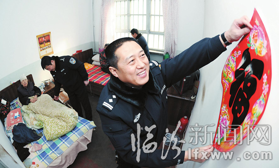 2月1日,市公安局交警支隊車管所民警在為85歲的于桂蘭殘疾老人貼“福”字。當日,該所民警來到堯都區康莊社區殘疾人服務站,為老人們帶來了米、面、油、水果等慰問品,并幫助他們貼春聯、掛燈籠,喜迎新春的到來。記者 李虎威 攝