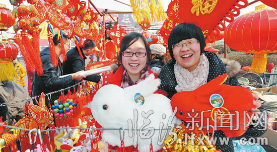 2月1日,兩位市民在展示剛買的兔子飾品。 春節(jié)來臨,我市大街小巷充滿了新春氣息。在平陽廣場上兔子飾品、春聯(lián)、門神、福字門貼、紅燈籠等喜慶飾品琳瑯滿目,呈現(xiàn)出一派紅紅火火的節(jié)日景象。記者 李虎威 攝