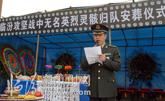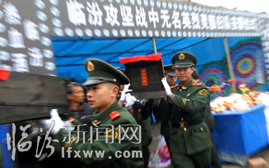 圖為臨汾攻堅戰中犧牲的無名英烈靈骸歸隊安葬儀式現場。