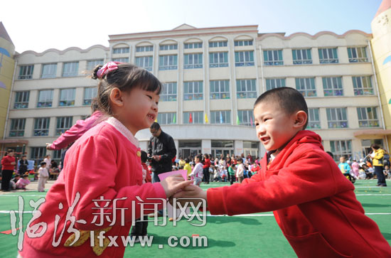 4月12日,臨汾市幼兒園小朋友在做“愛心傳遞”游戲。