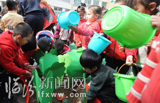 4月12日,臨汾市幼兒園小朋友在做“愛護小樹苗”游戲。