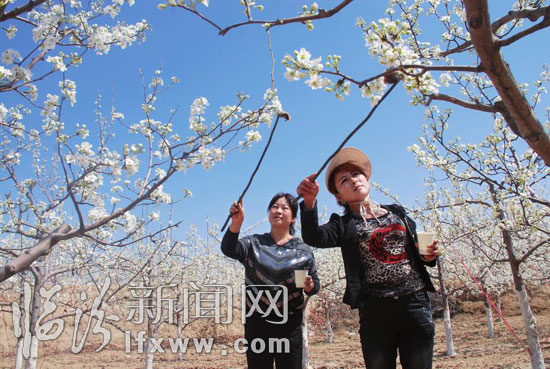 近日,在隰縣午城鎮(zhèn)陽德塬萬畝梨園內(nèi),兩名婦女正在梨園內(nèi)進行人工授粉。隰縣素有“黃梨之鄉(xiāng)”美譽,先后被國家農(nóng)業(yè)部、林業(yè)部命名為“中國金梨之鄉(xiāng)”和“中國酥梨之鄉(xiāng)”,水果產(chǎn)業(yè)已成為該縣支撐廣大農(nóng)民增收致富的第一主導產(chǎn)業(yè)。 記者 李自強 攝