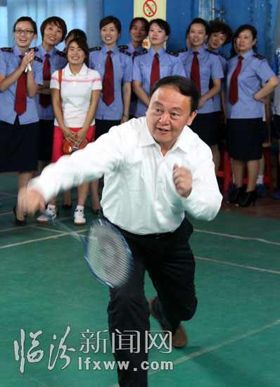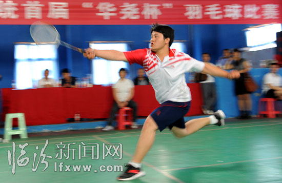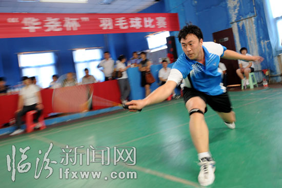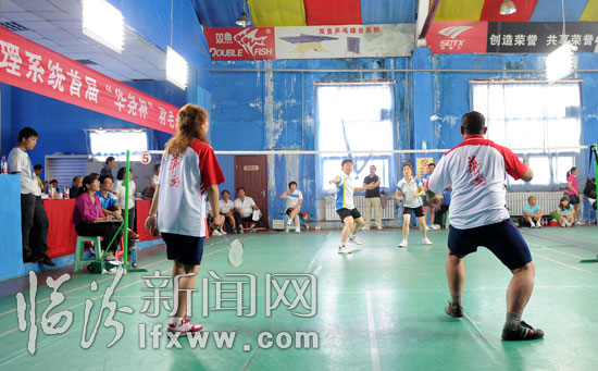 臨汾新聞網訊 5月25日,我市工商行政管理系統的職工在進行羽毛球比賽。當日,為慶祝建黨90周年,我市工商行政管理系統首屆“華堯杯”羽毛球大賽舉行,來自市局機關和各縣市區的20支代表隊的116名選手參加了比賽,旨在以健康的體魄投身全民健身運動,以飽滿的精神狀態迎接黨的生日的到來。(記者 閆銳鵬 攝)