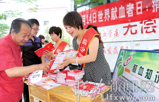 臨汾新聞網訊(記者 閆銳鵬 攝)6月14日,市中心血站的工作人員在為市民講解獻血知識。當日是世界獻血者日,市中心血站和市無償獻血志愿者開展了世界獻血者日宣傳活動,感謝多年來熱心參與無償獻血的市民,號召更多人參與到定期自愿獻血中來,去挽救更多的生命。