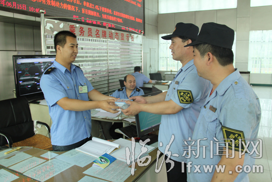 臨汾新聞網訊(通訊員 楊立江 龐繼福)暑運來臨之際,為確保鐵路機車乘務員的身體健康,侯馬北機務段為每名機車乘務員配備裝有防暑降溫藥品的“小藥箱”,受到廣大職工的普遍歡迎。圖為6月15日,該機務段調度室出勤調度員正在為出勤機車乘務員發放防暑降溫“小藥箱”。