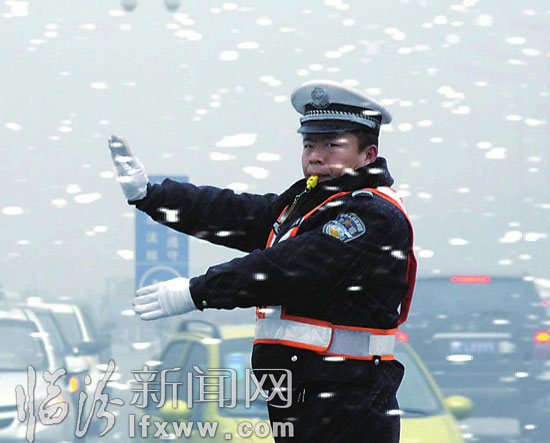 1月20日,臨汾交警支隊(duì)直屬北城大隊(duì)民警在市區(qū)郭家莊十字崗雪中執(zhí)勤,保障市民平安出行。(張秋紅 毛晉秀 攝)