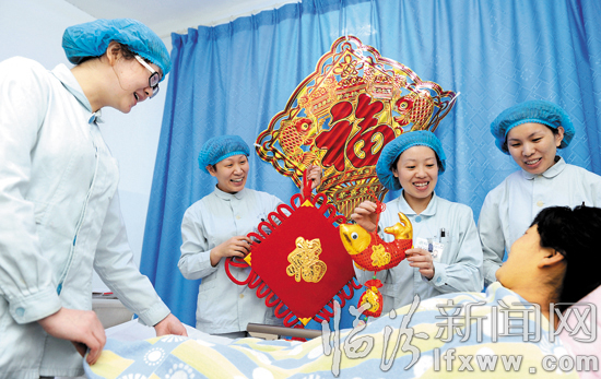 1月23日,市人民醫(yī)院重癥醫(yī)學(xué)科的護理人員在向因病不能回家過年的患者拜年。當日是大年初一,市人民醫(yī)院重癥醫(yī)學(xué)科的病房內(nèi)充滿了濃濃的年味,醫(yī)護人員精心布置了病房,為患者提前包了餃子,在為患者做好精心護理的同時也讓患者過了個溫馨快樂的幸福年。